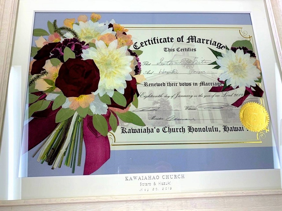 挙式の際に生花でお作りしたブーケを押し花にして、
