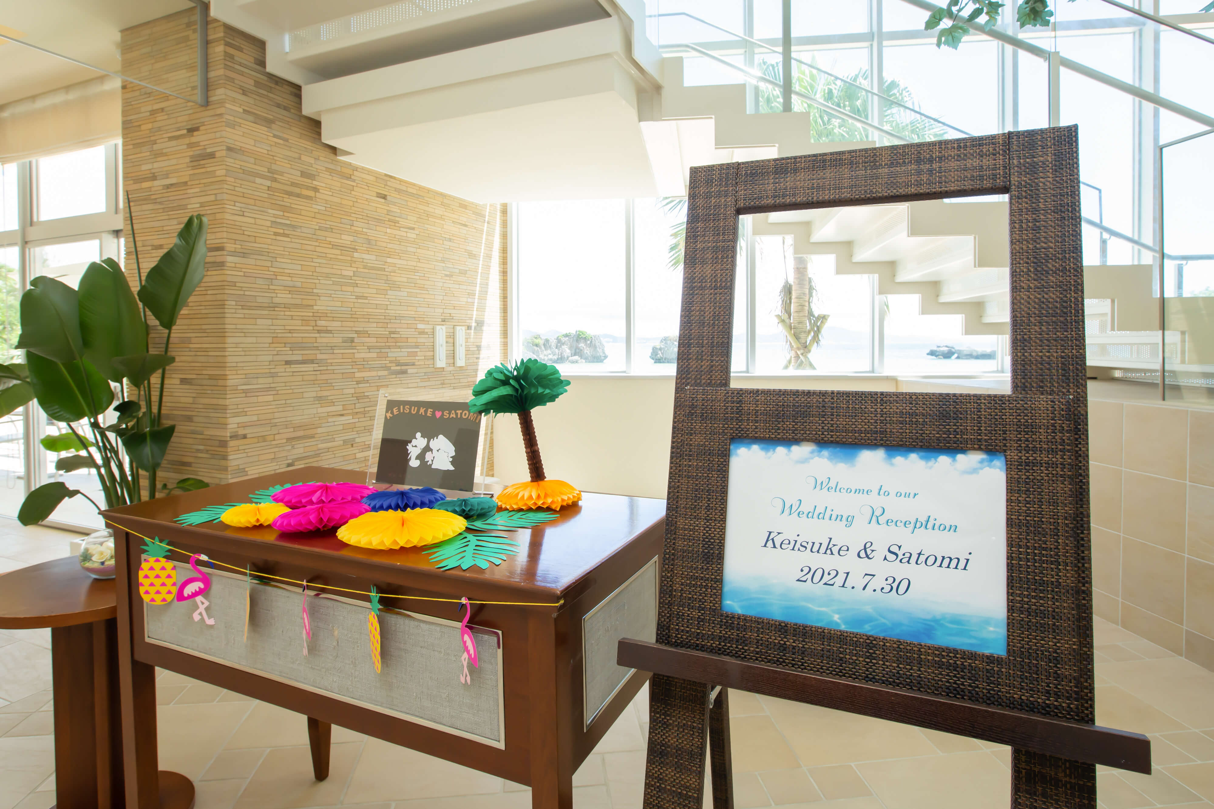 お持ちいただいたウェルカムスペースの装飾が南国をイメージする鮮やかなカラーで