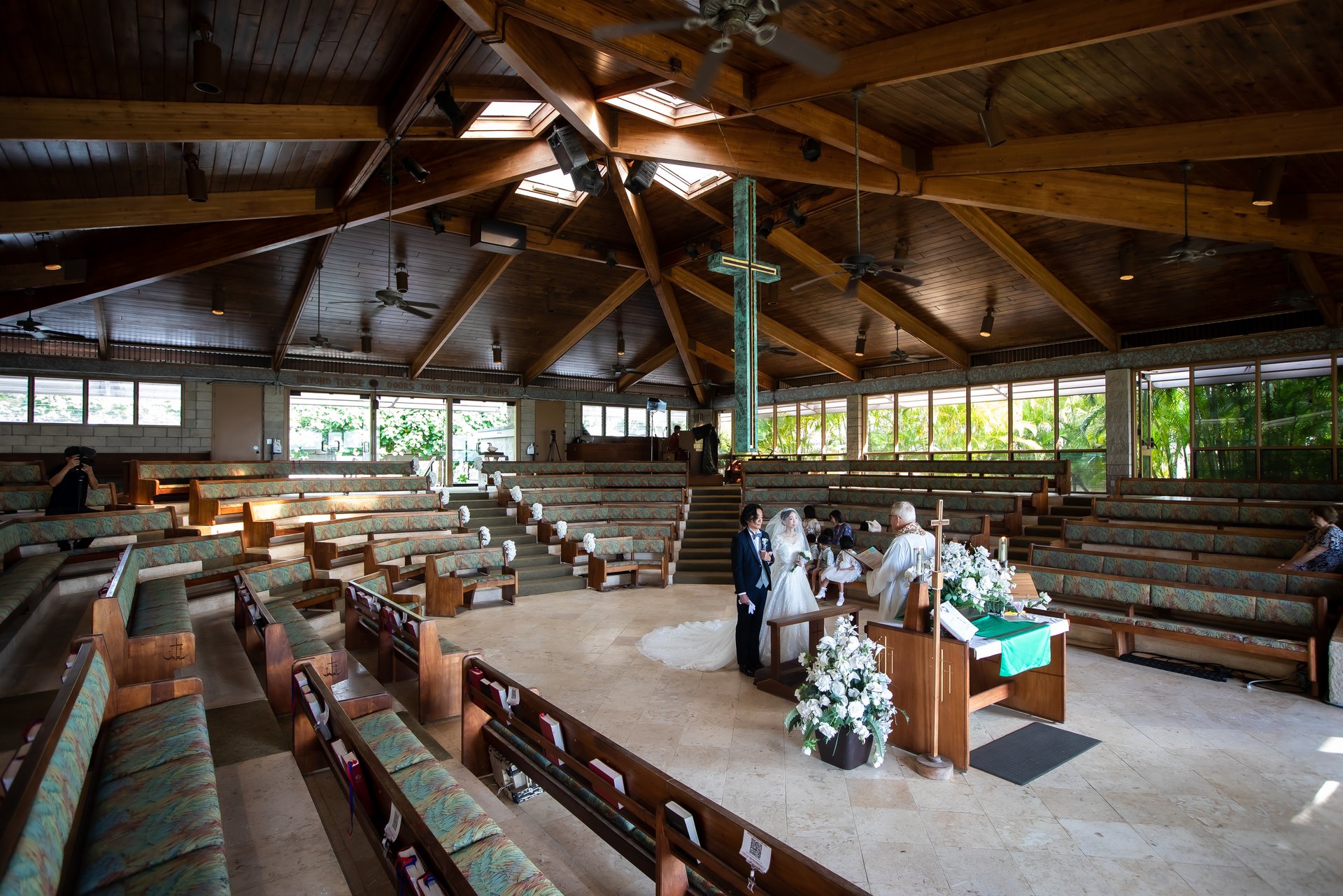 ガラス張りの造りが特徴的なこの教会は、会場の外にそびえたつヤシの木や
