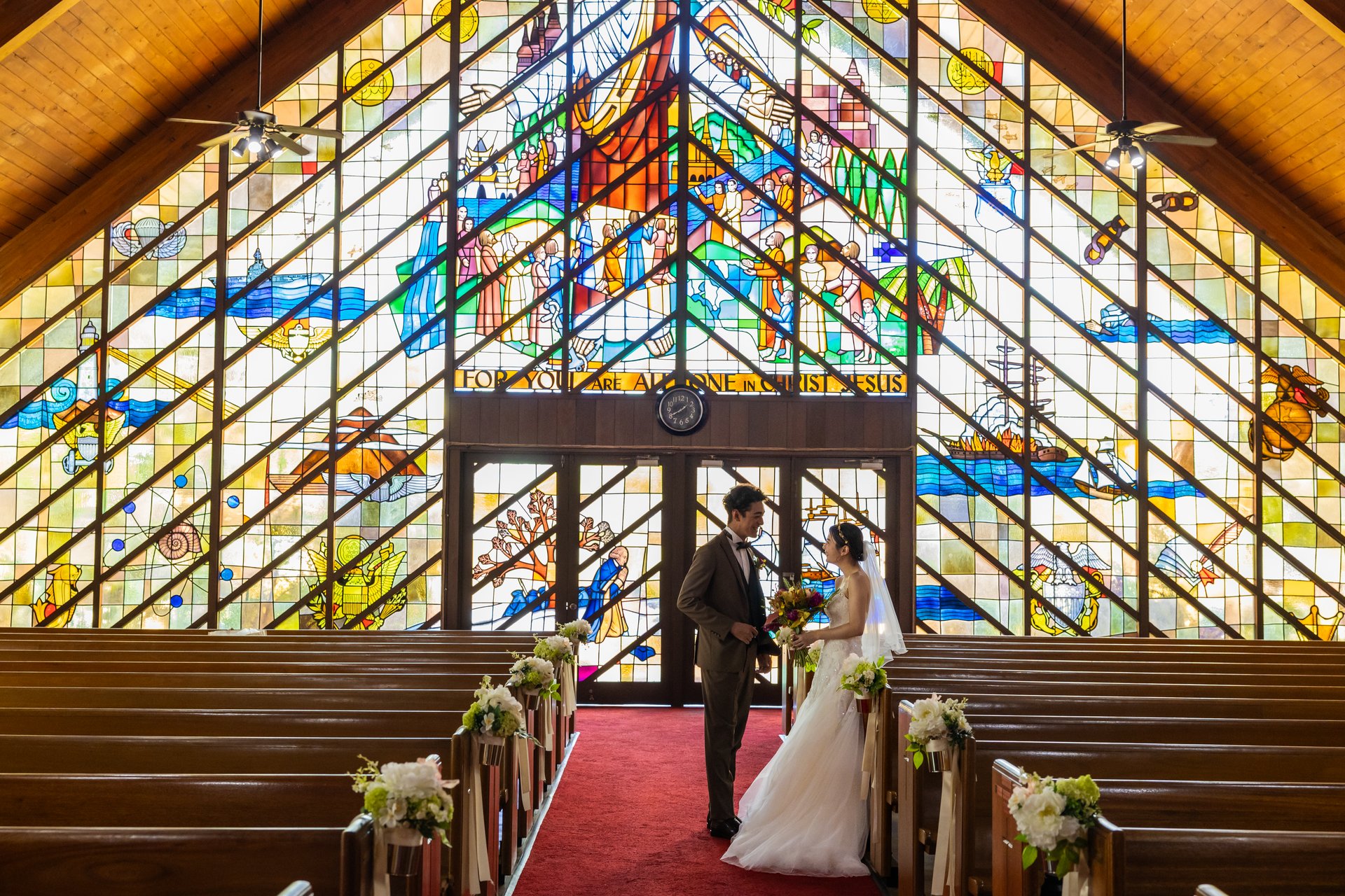 ステンドグラスの中には船など海のモチーフやヤシの木などハワイらしいモチーフが描かれており、