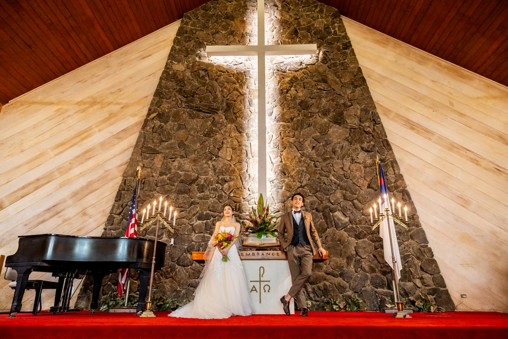 ブラウンで統一された落ち着きのある内装に、正面の祭壇にはハワイの溶岩石が使われています。