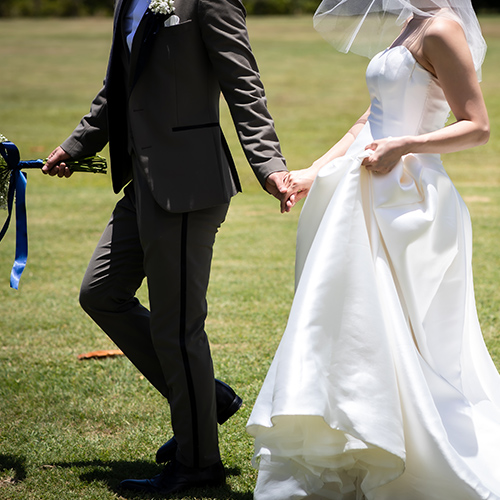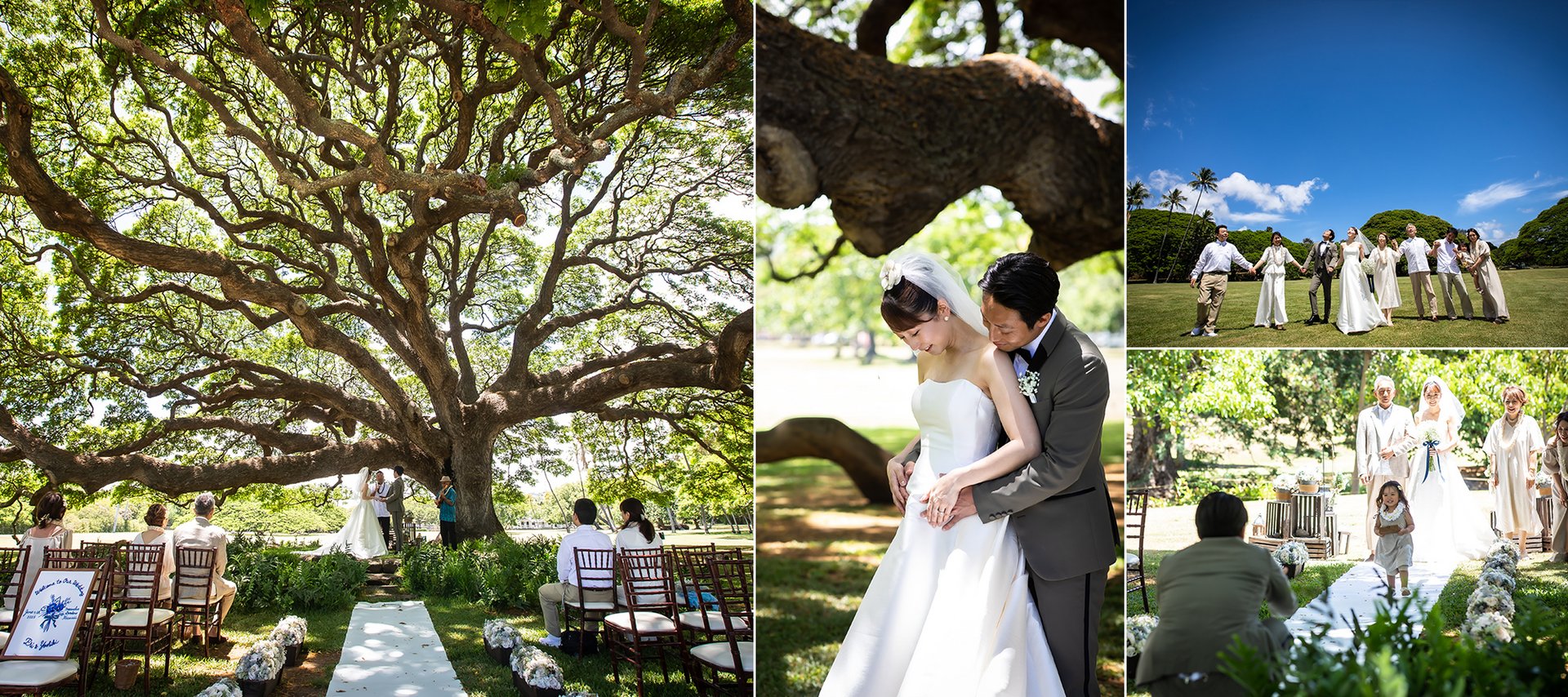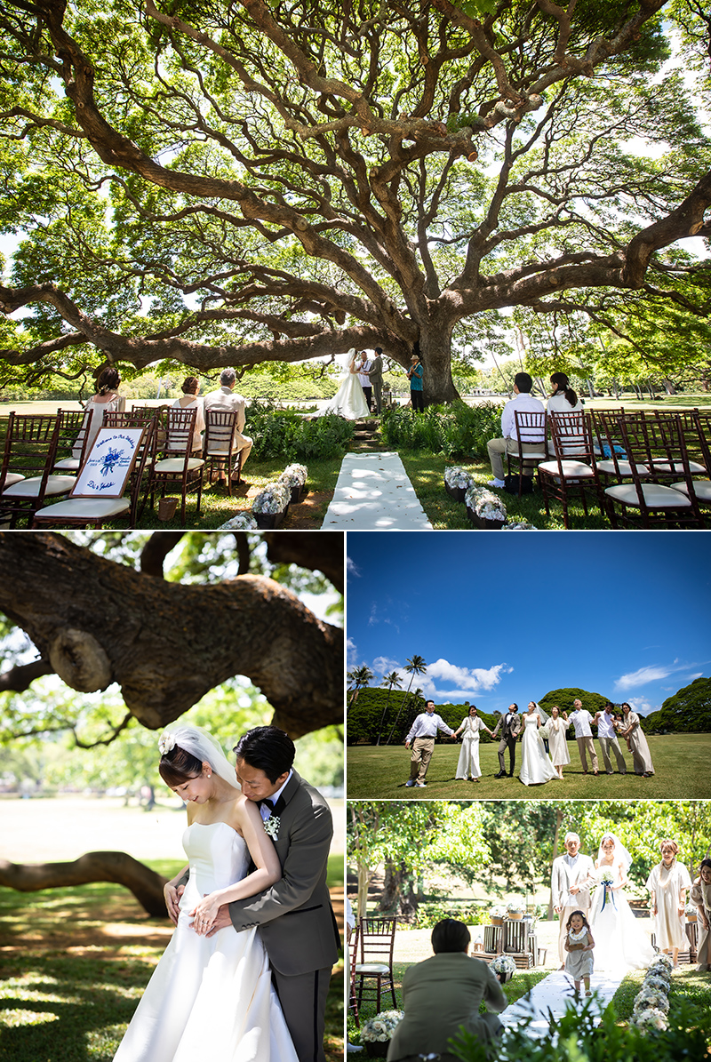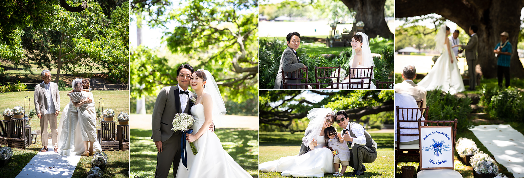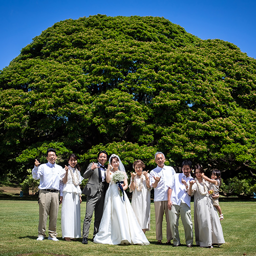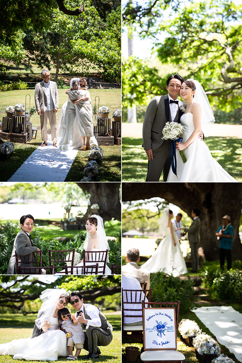 母が作ったコサージュを活かせるようなシンプルなドレス、髪型にこだわりました。また、開放感のあるガーデンウェディングに憧れており、且つ伝統的な場所でもあるモアナルアガーデンという場所にもこだわりました。家族だけの少人数の挙式で、ラフな格好でありながらも色合いを白かベージュという指定で統一感をもたらしました。