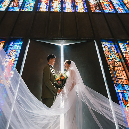 おふたりはステンドグラスに西日が差し込む16時の挙式をお申込いただきました!