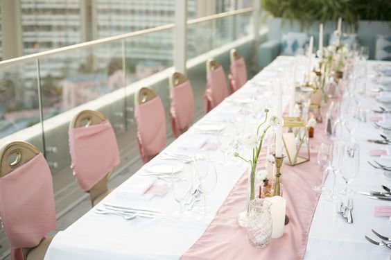 オーシャンスイートワイキキの魅力をより感じていただくために、華やかで洗練されたレセプションを提案する、ファーストウエディング限定のオリジナルテーブルコーディネート。海外のカップルのように、スタイリッシュで洗練された雰囲気のウエディングパーティを実現してみませんか?